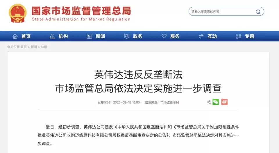 9月15日,市场监管总局发文称英伟达公司违反反垄断法,依法决定对其实施进一步调查。