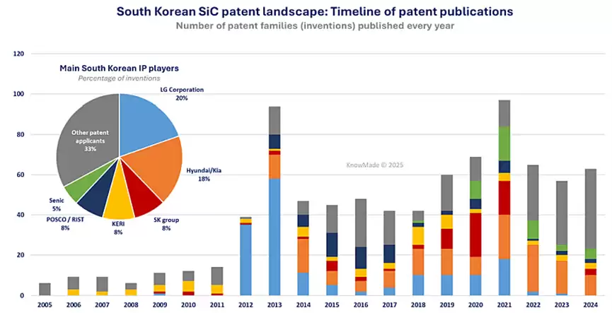 这一年似乎标志着大多数韩国工业参与者对 SiC 活动的重组,SKC 剥离了一家 SiC 基板公司 (Senic),LG Innotek 出售了关键的 SiC 专利(LX Semicon、S-tech),SK Inc. 收购了 Yes Powertechnix (YPT)。与此同时,几家材料公司大幅减少了其知识产权活动(浦项制铁、LG 集团和 SK 集团)。