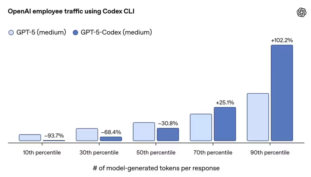 对于简单任务,GPT-5-Codex输出token数比GPT-5减少了93.7%,也就是简单任务响应提速10倍。