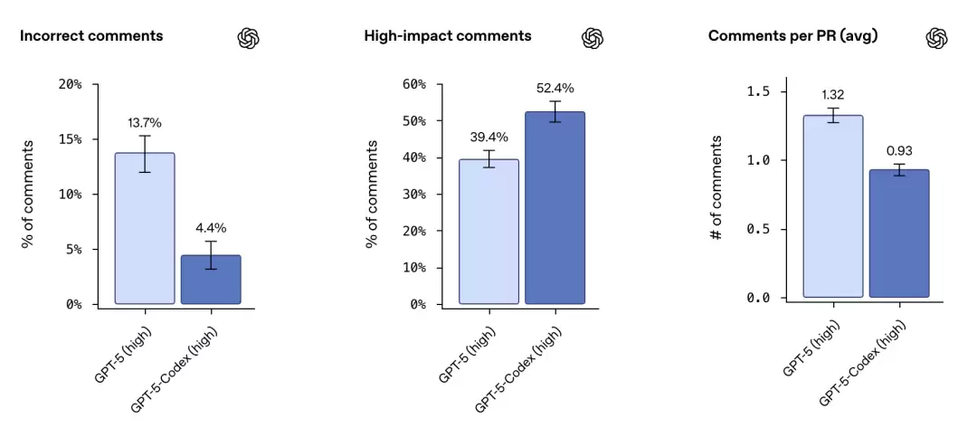GPT-5-Codex还经过了专门的代码审查训练。在审查流行开源项目的最新PR时,错误评论率从13.7%降到了4.4%,高影响力评论的比例从39.4%提升到52.4%。它能理解PR的真实意图,遍历整个代码库和依赖关系,甚至运行代码和测试来验证行为。