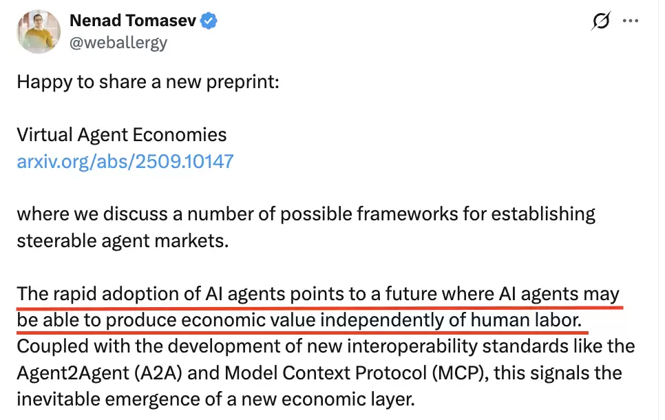 DeepMind资深科学家Nenad Tomasev指出:AI Agent的迅猛发展,正在催生一个由人工智能自主创造价值的全新经济层级。