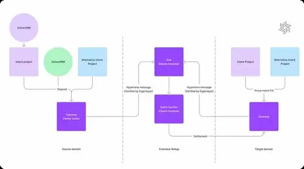Everclear 在每条支持的链上部署标准化合约。用户可以生成“发票”来表示他们的跨链转移意图。被称为“求解器”的参与者可以相互“平衡”这些意图。如果一段时间内无人领取发票,则会启动荷兰式拍卖,逐步降低转移金额,直到有人领取。