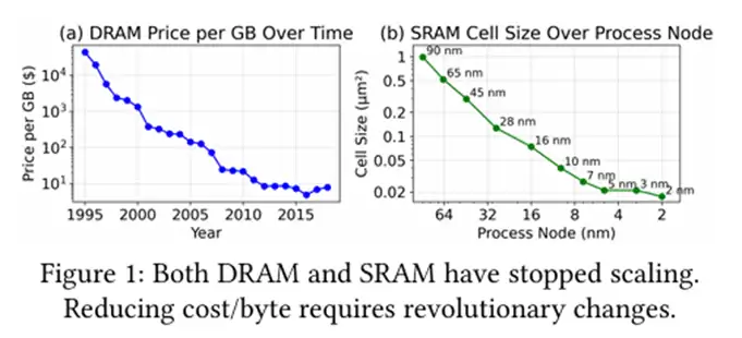 二维(2D)半导体缩放技术曾以更低成本实现更高存储密度与容量。然而图1显示,无论是SRAM还是DRAM,传统2D缩放都已走到尽头。DRAM的每字节成本十余年来始终停滞不前,这正是服务器规模扩大后DRAM成本占据系统成本主导地位的原因。[2] SRAM同样面临类似瓶颈:我们已无法制造更微小的SRAM单元。