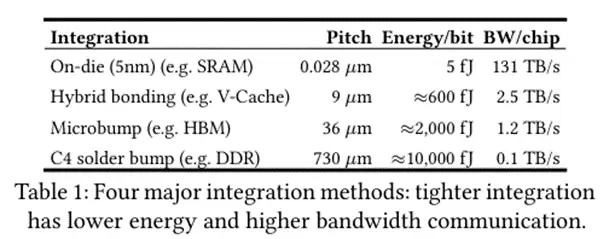 DRAM的带宽限制和能耗问题源于其在印刷电路板(PCB)上的连接方式——该板载铜走线和凸点引脚数量有限(例如DDR5仅有288个引脚)。高带宽内存(HBM)通过改进集成技术,将DRAM芯片重新定位并紧密排列。通过在多个DRAM芯片下方嵌入封装内硅基逻辑芯片,并采用硅通孔技术连接,每组HBM3E堆栈可实现1024个引脚与更短的互连距离。这种引脚数量的显著差异直接转化为HBM的带宽优势。表1展示了更紧密的物理集成如何实现更高引脚密度、更宽带宽及更低能耗。较低的引脚密度则需要更高速度的信号电路,从而增加能耗。