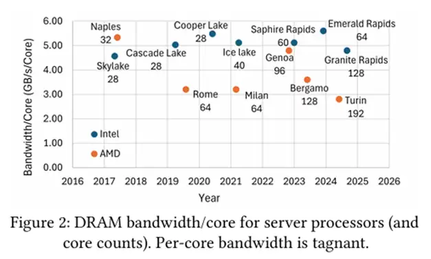 处理器插槽的DRAM带宽正缓慢提升:现代DDR5-5600内存条带宽达358Gbps,且每插槽内存条数量从8条增至12条,总带宽达4.3Tbps。然而同期,每插槽核心数量的增长已超越或匹配带宽提升幅度。图2展示了自2018年以来英特尔与AMD服务器处理器封装的单核带宽:该指标已陷入停滞。