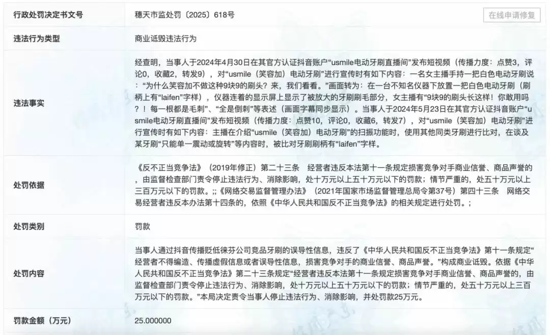 信用广东正式的一则公示透露:今年7月28日,usmile母公司广州星际悦动股份有限公司因发布贬低竞争对手的误导性内容,被广州市天河区市场监管局处以25万元罚款。