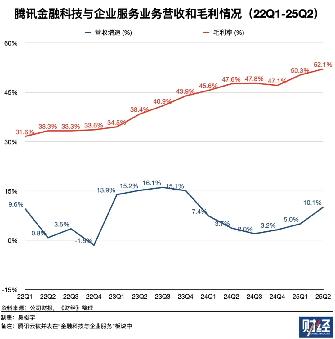 腾讯云的业绩收入并表在“金融科技与企业服务”板块中,该板块2024年营收2120亿元。2024年一季度-2025年二季度,腾讯金融科技与企业服务业务的毛利率为52.1%,它在14个季度内提升了20个百分点,是三年半来的最高水平。