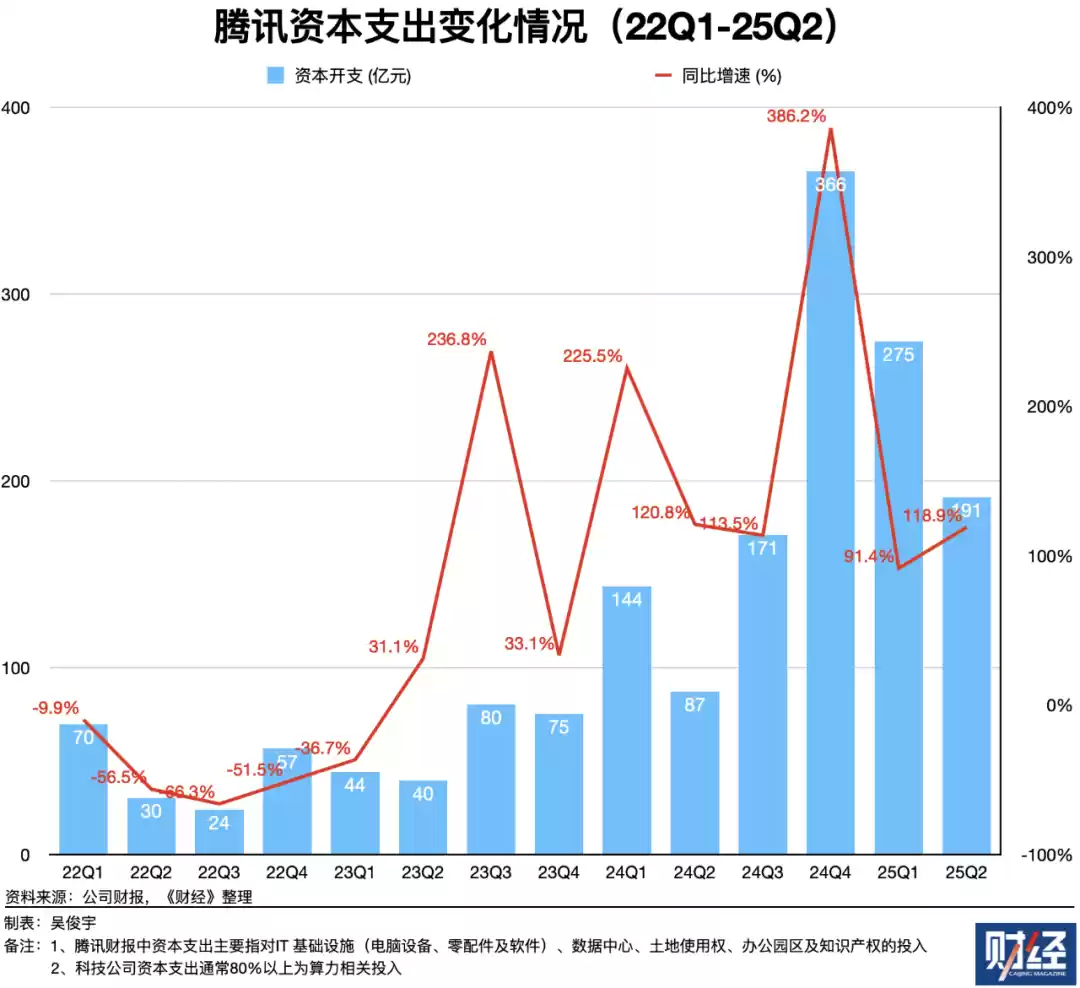近一年(2024年三季度-2025年二季度),腾讯资本支出总额为1023亿元,同比增长178%。这个增速超过了微软、亚马逊、谷歌等国际同行。同期阿里资本支出总额1126亿元。《财经》多方了解到,中国市场同期资本支出总额超过1000亿元的大型科技公司,仅有腾讯、阿里、字节跳动三家。