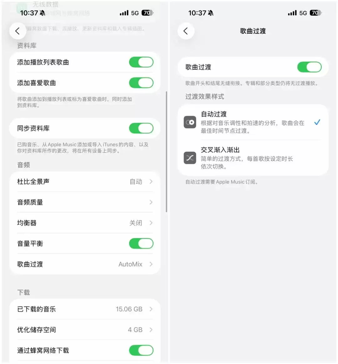 当然,如果你不完全喜欢这个「自动过渡」的歌曲过渡方式,那么可以在「设置」>「音乐」中找到音乐部分的「歌曲过渡」选项,在这里你可以将歌曲过渡方式切换为传统的「交叉渐入渐出」,或者干脆关掉「歌曲过渡」功能。