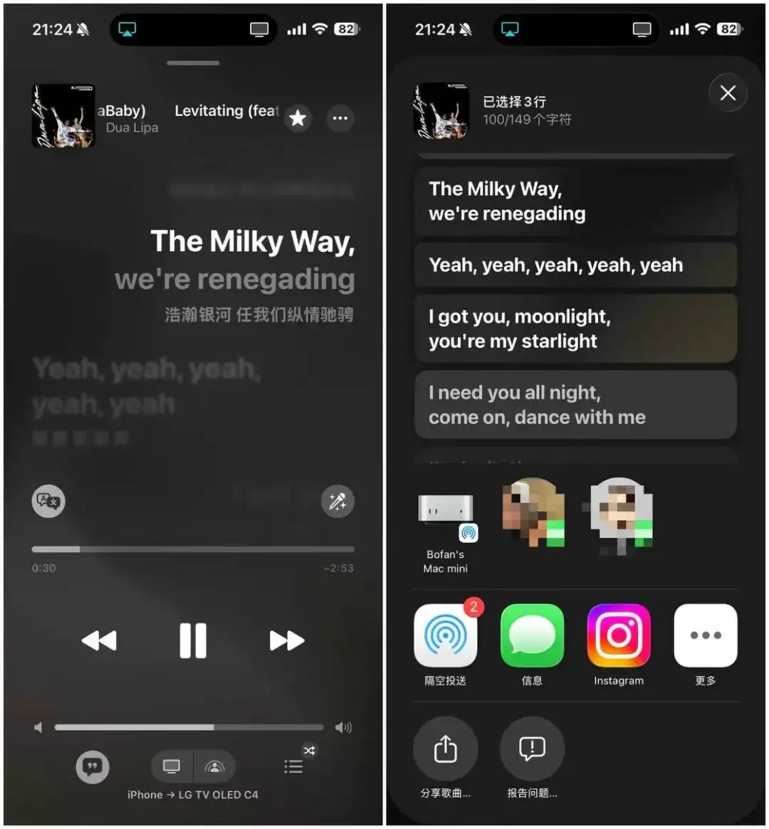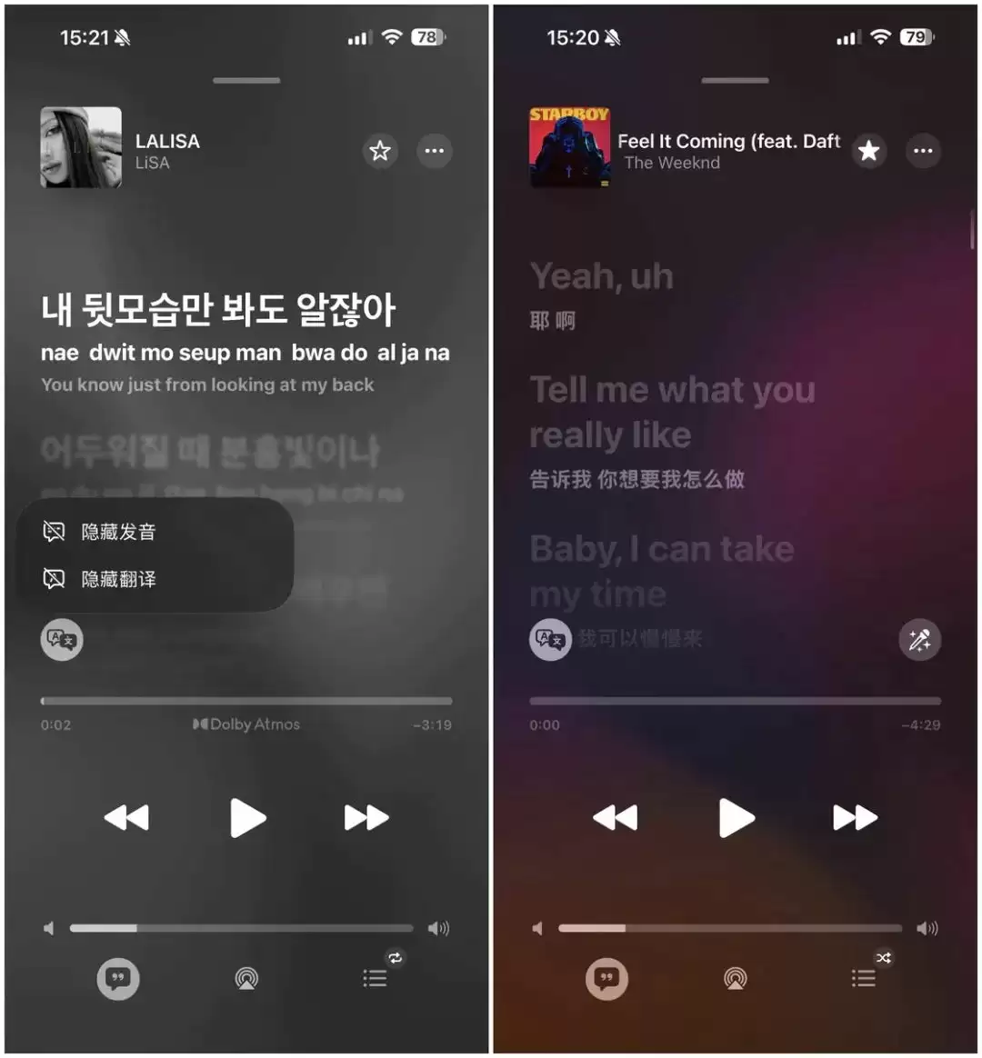 Apple Music 的这个新功能还有一个小细节,那就是长按歌词进行分享的时候,翻译和发音都会被隐藏,只显示原本的歌词。