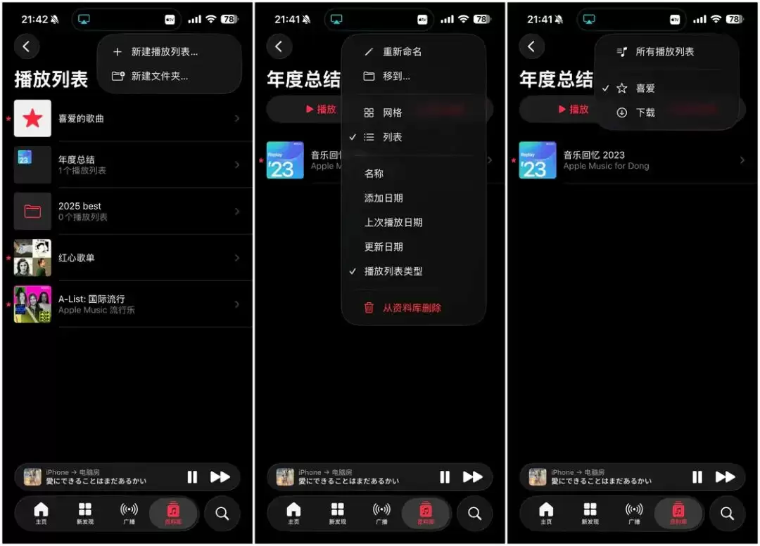 打开 Apple Music 后,进入「资料库」标签页,然后点击打开播放列表,在界面的右上角点击加号按钮,就可以看到「新建文件夹」的功能,在文件夹中我们还可以进行筛选、排序、切换视图、重命名、移动等操作。