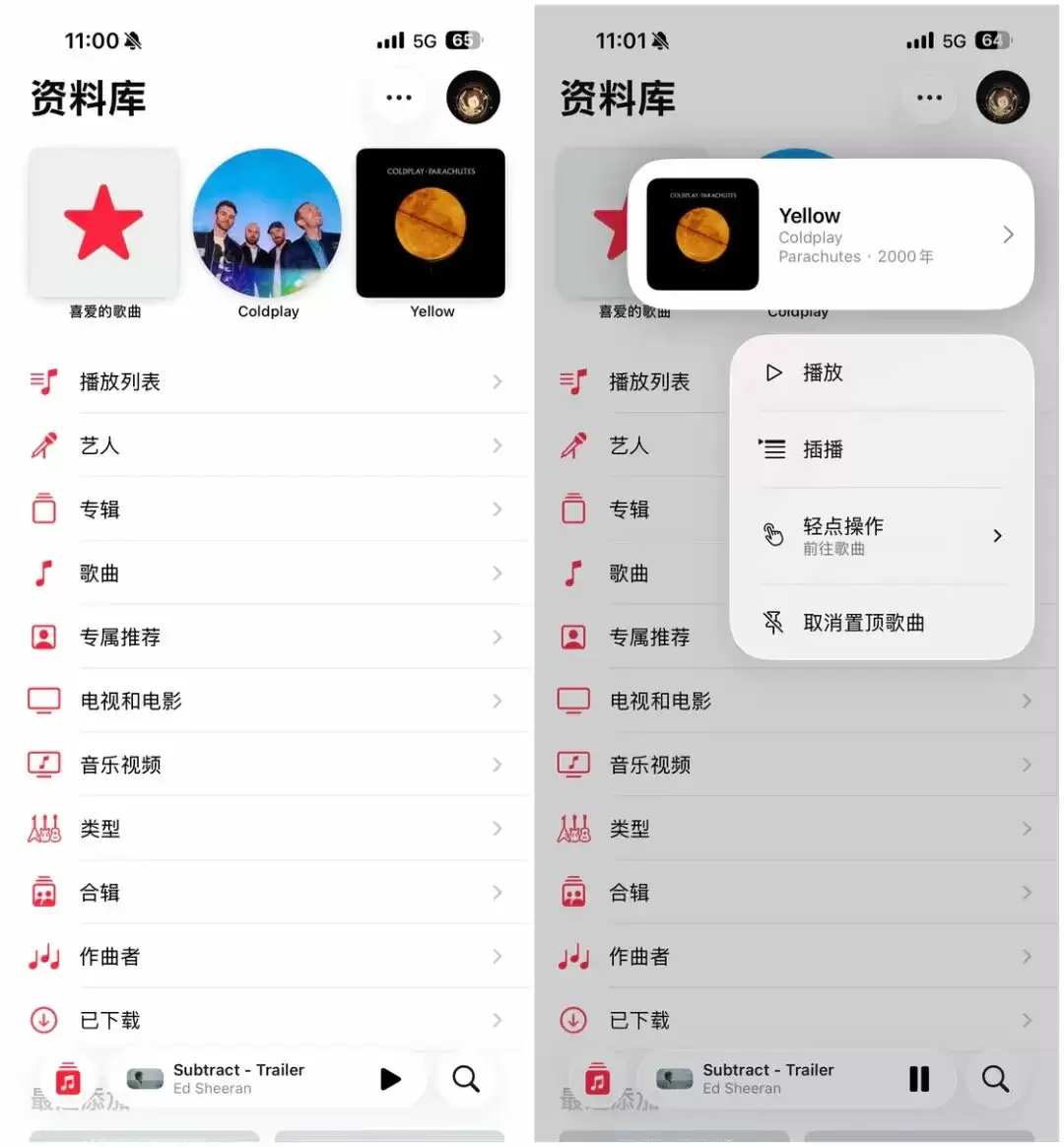 将播放列表、专辑、歌曲、歌手、音乐视频等置顶显示的方法,既简单直观又操作统一,我们只需长按资料库中的任意对象(播放列表、专辑、歌曲、歌手、音乐视频等),然后在弹出的菜单界面中选择「置顶 XXX」就行。