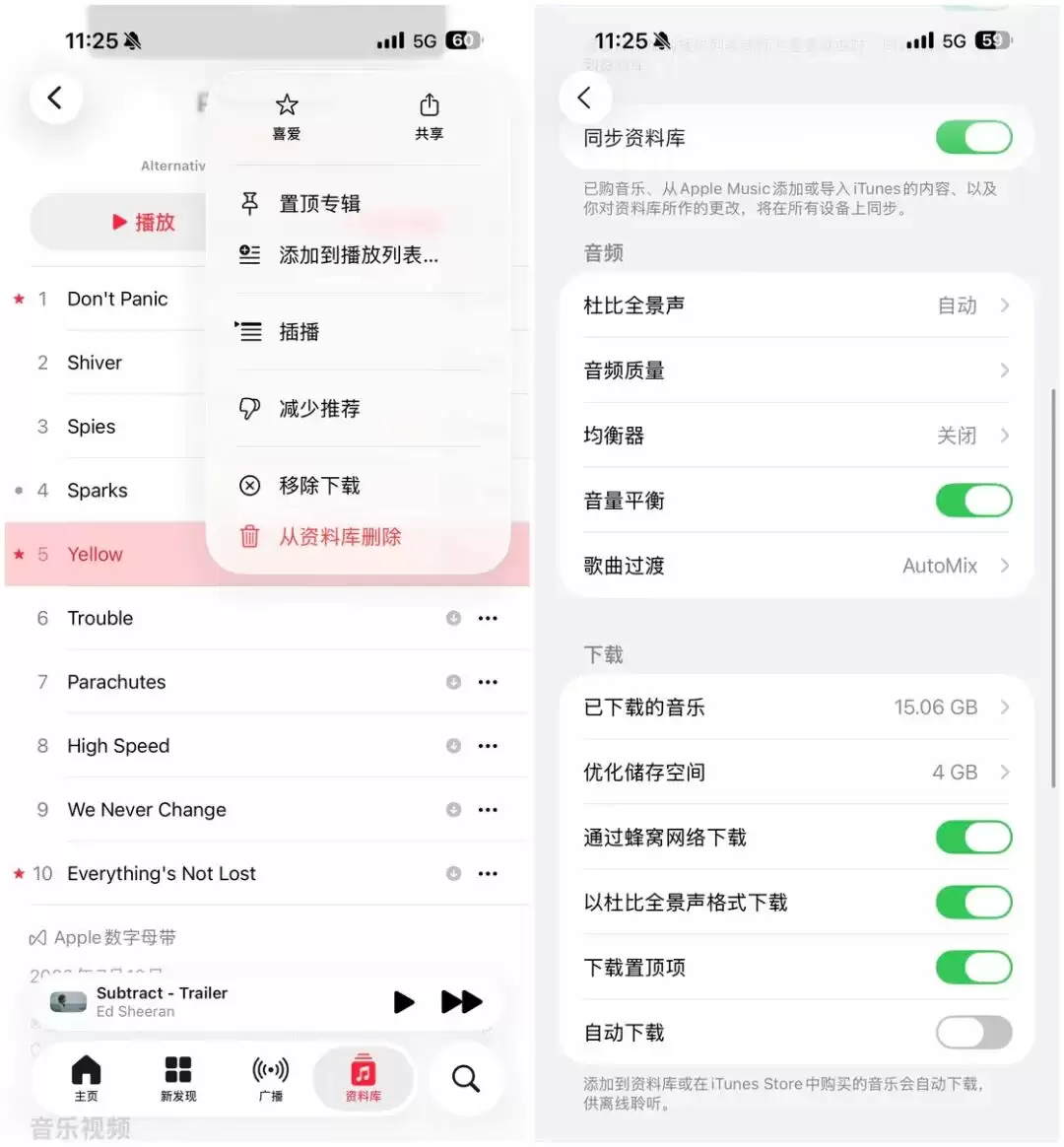 「置顶音乐」还有一个非常实用的特性,那就是自动下载。所有被置顶的音乐,包括播放列表、专辑、视频等都会自动下载到本地,这样一来就可以节省流媒体播放的蜂窝网络流量,也可以在乘坐飞机等场景下不用担心忘记提前下载音乐。如果你不需要自动下载置顶音乐,那么也可以在「设置」>「音乐」中找到「下载置顶项」的选项,点击关闭即可。