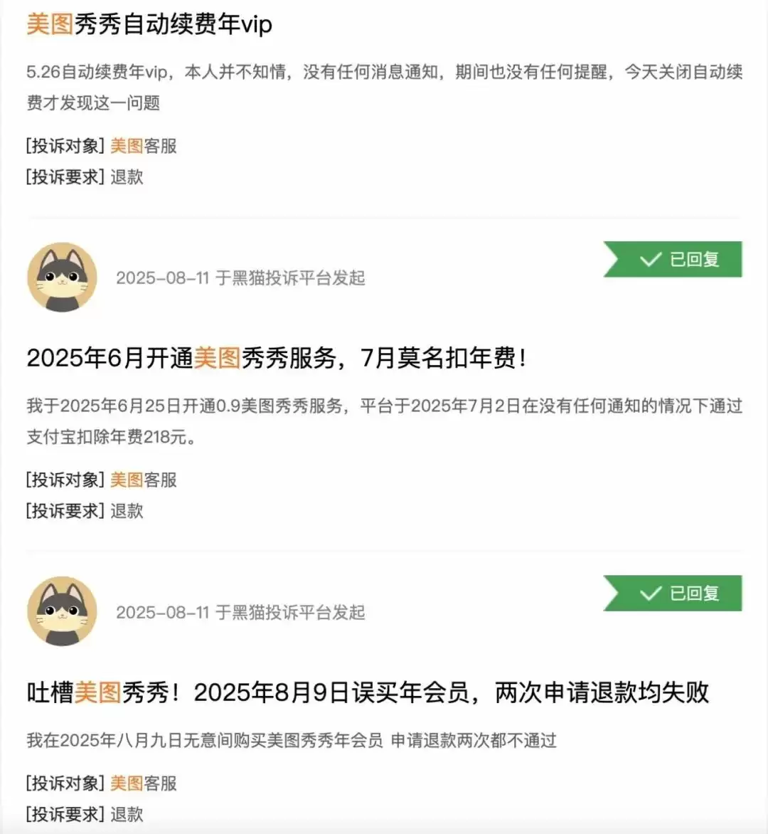 在黑猫投诉等平台上,大量用户反映如美图秀秀APP存在“自动续费未提醒”“诱导充值”以及“退款申请失败”等问题。