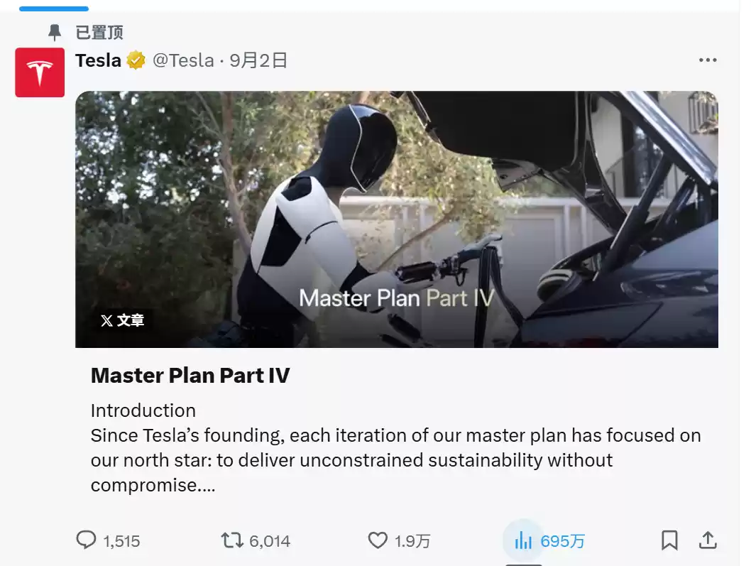 9月2日,特斯拉最新在X平台上正式发布“大师计划第四篇章”(Master Plan Part IV),全面改写公司的宏大叙事。它将公司的发展重心前所未有地从电动汽车和能源全面转向人工智能和机器人领域,旨在通过大规模地将AI融入物理世界,实现一个“可持续富足”的社会。
