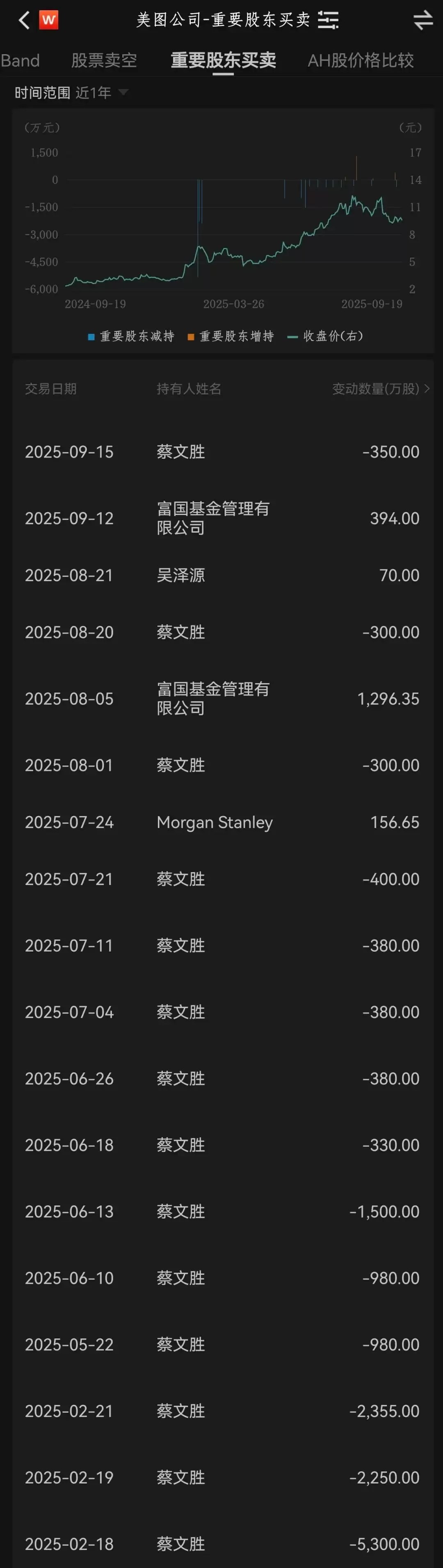 根据香港联交所披露文件显示,9月15日蔡文胜通过市场交易出售350万股美图公司股票,平均成交价为每股9.5675港元,共计套现3348.63万港元。此次减持后,其持股比例下降至9.95%。