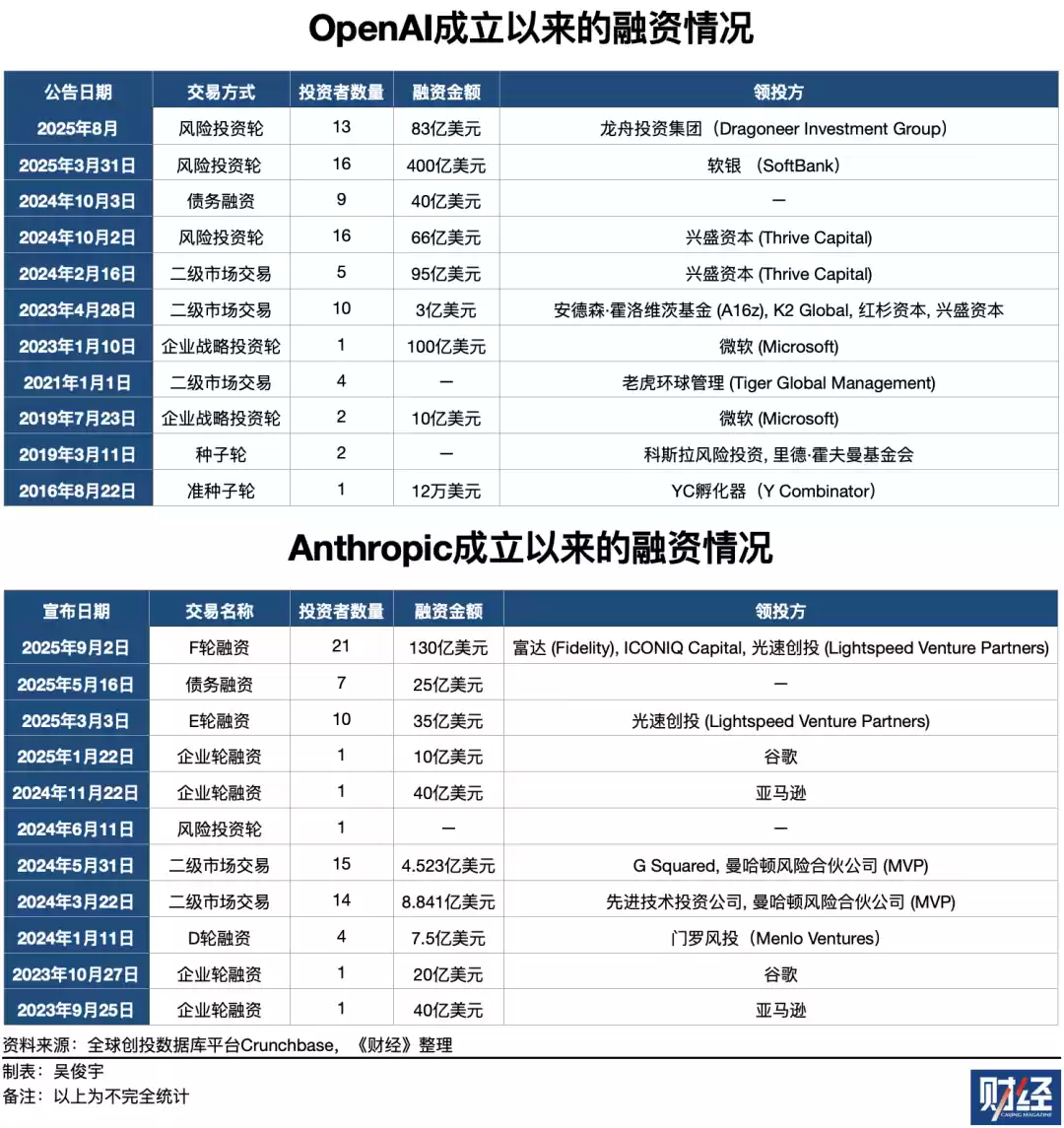 今年8月和9月,OpenAI和Anthropic接连完成新一轮融资,它们分别成为全球第三、第四大独角兽(第一是估值4000亿美元的SpaceX,第二是估值3150亿美元的字节跳动)。