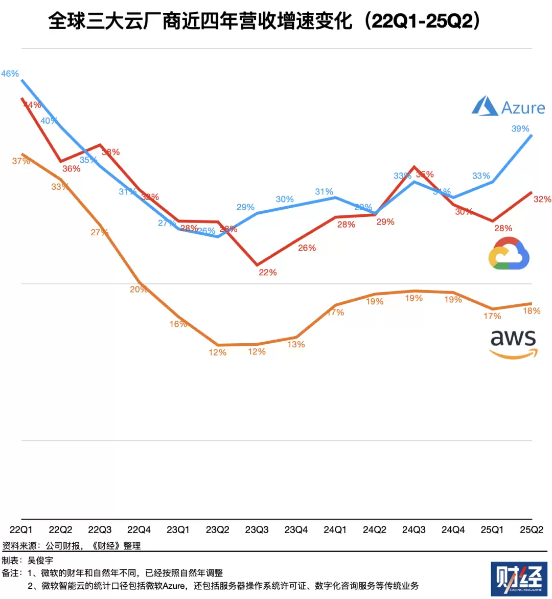 押注AI取得成功后,微软Azure真正浮出水面。微软今年7月首次披露微软Azure营收——2025财年750亿美元,同比增长34%,新增收入255亿美元。同期亚马逊AWS营收1164亿美元,同比增长18%,新增收入210亿美元。这意味着,微软Azure近一个财年新增收入超过了亚马逊AWS,两者收入差距在迅速缩小。