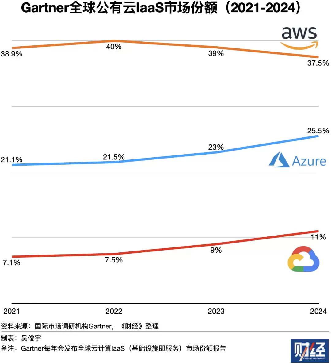 两者的市场份额差距也在缩小。国际市场调研机构Gartner数据显示,微软Azure近三年市场份额逐步提升,和亚马逊AWS的差距缩小到12%。