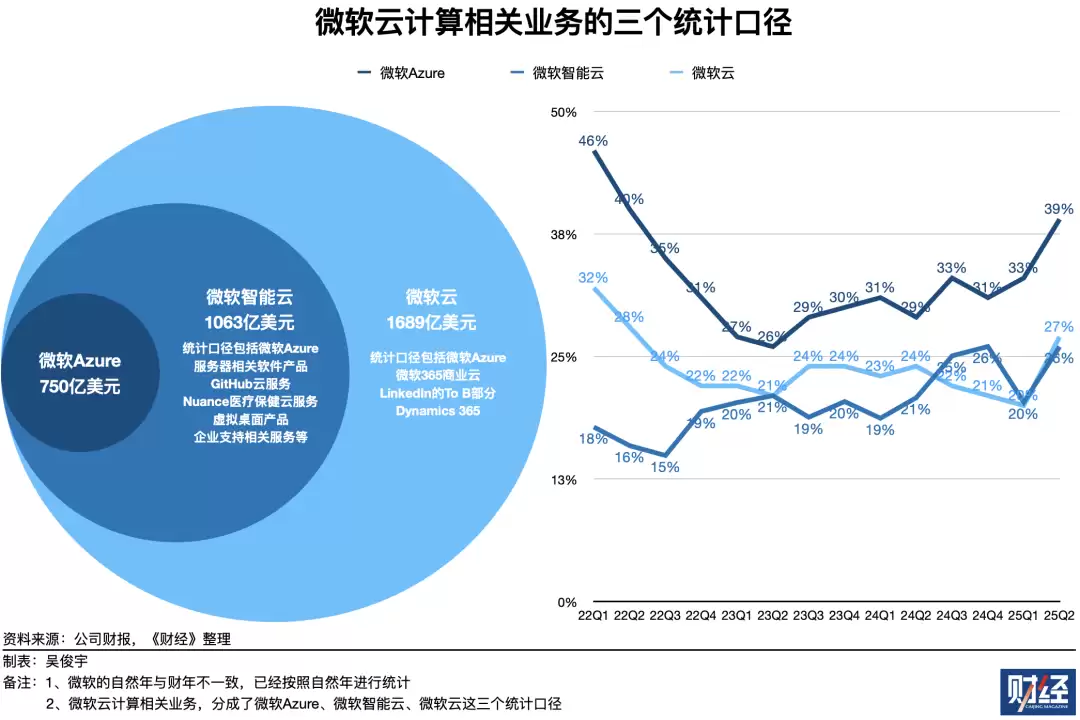 微软在云计算赛道另一个无法忽略的优势是,它拥有“水桶型”的产品线。它们被统称为——“微软云”(Microsoft Cloud,包括微软Azure+生产力流程等软件),2025财年营收1689亿美元,同比增长26.3%。