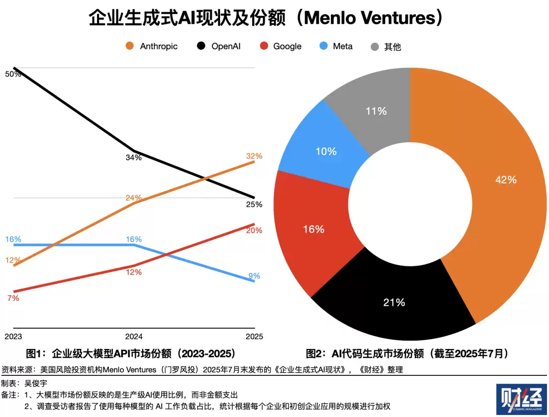 美国风险投资机构Menlo Ventures(门罗风投)每年会发布《企业生成式AI现状》。Menlo Ventures在2025年7月末公布的数据显示,在代码生成市场,Anthropic的市场份额高达42%,是OpenAI的两倍。而在企业级大模型API市场,Anthropic已经取代OpenAI成为领头羊,市场份额为32%。