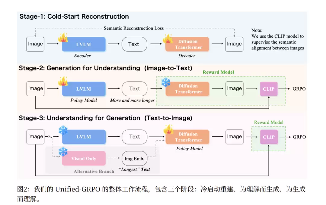 UAE提出了一个名为Unified-GRPO的三阶段训练策略,实现了理解和生成的"左右循环,两向加强"。