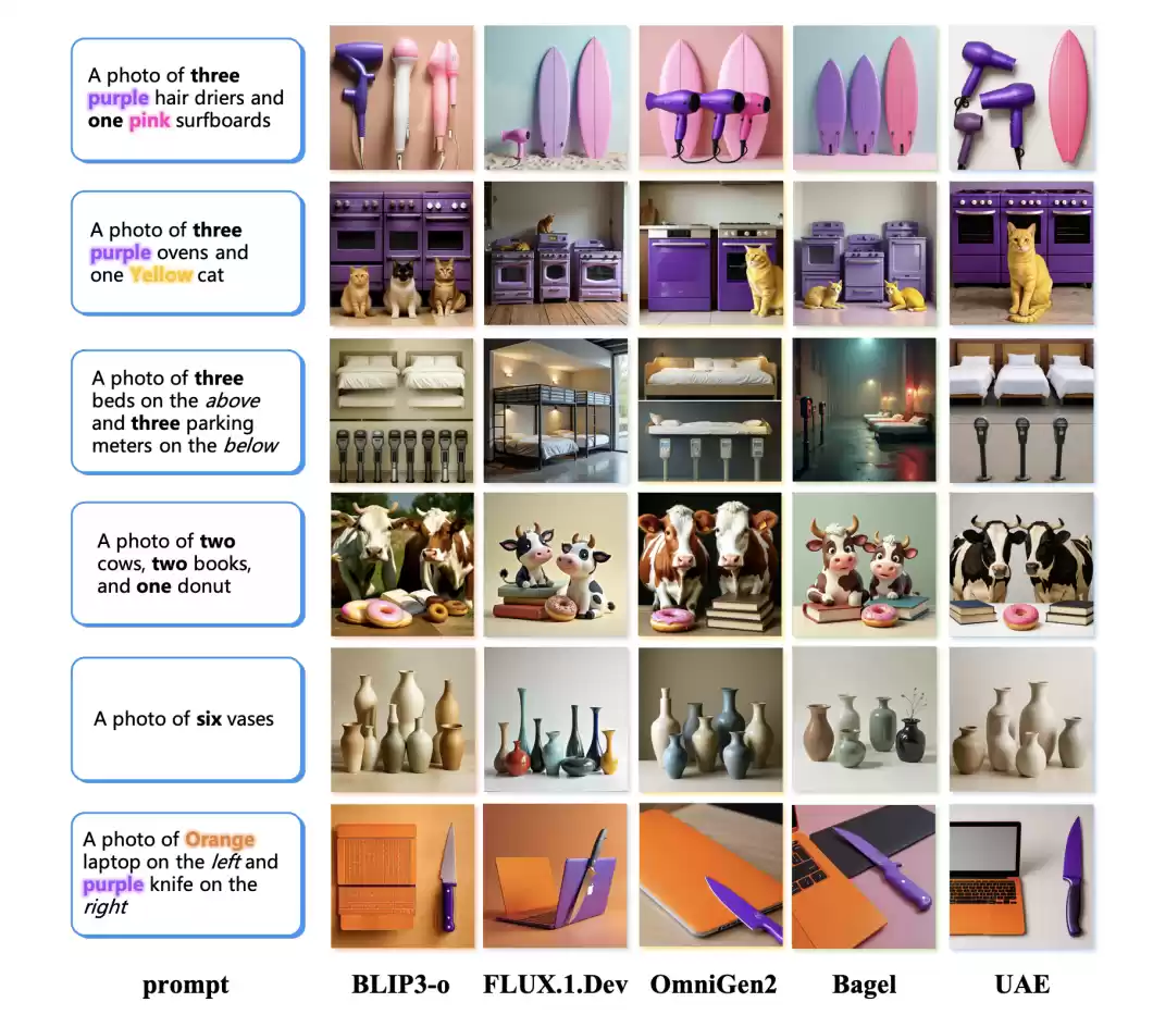 而生成方面,UAE更是获得了同意模型SOTA。GenEval基准上UAE获得0.86综合得分,在统一模型中排名第一,特别是在需要精确理解的计数(0.84)和颜色归因(0.79)任务上表现突出。在更具挑战性的复杂场景处理GenEval++基准(包含三个或更多对象的复杂场景)中,UAE也获得0.475的最佳得分。