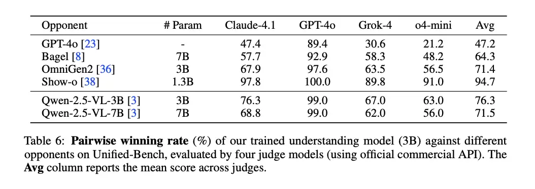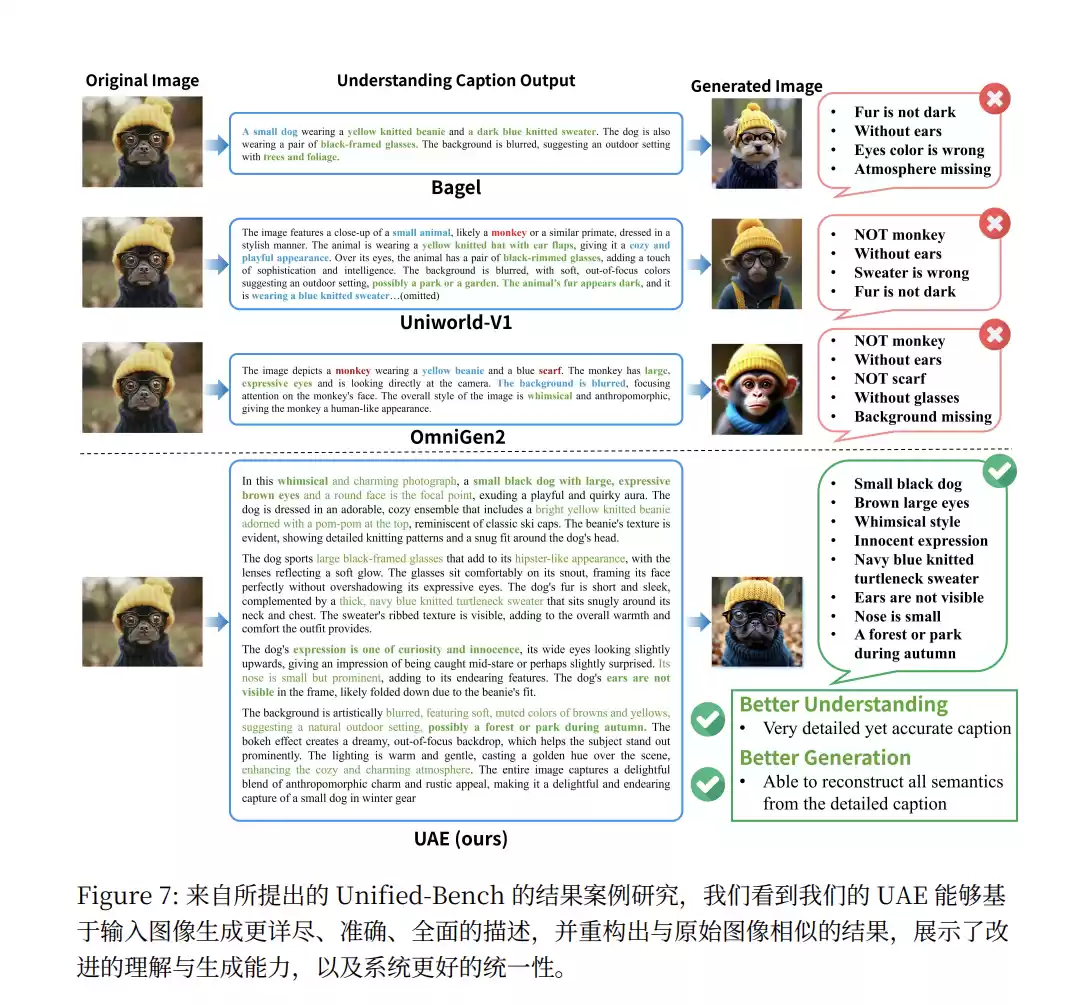 研究者将UAE理解模型生成的描述,与其他知名模型(如Bagel, OmniGen2)生成的描述进行比较,并请了多个顶尖大语言模型(如GPT-4o, Claude-4.1)作为裁判。UAE的描述在完整性、属性绑定、关系和空间保真度等多个方面都更胜一筹。