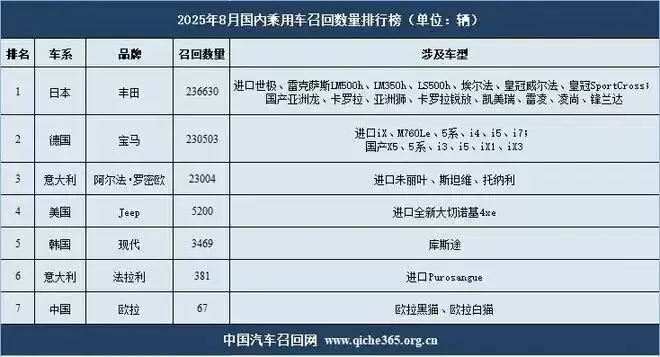 图/2025年8月国内乘用车召回数量排行榜 来源/互联网 新能源观截图