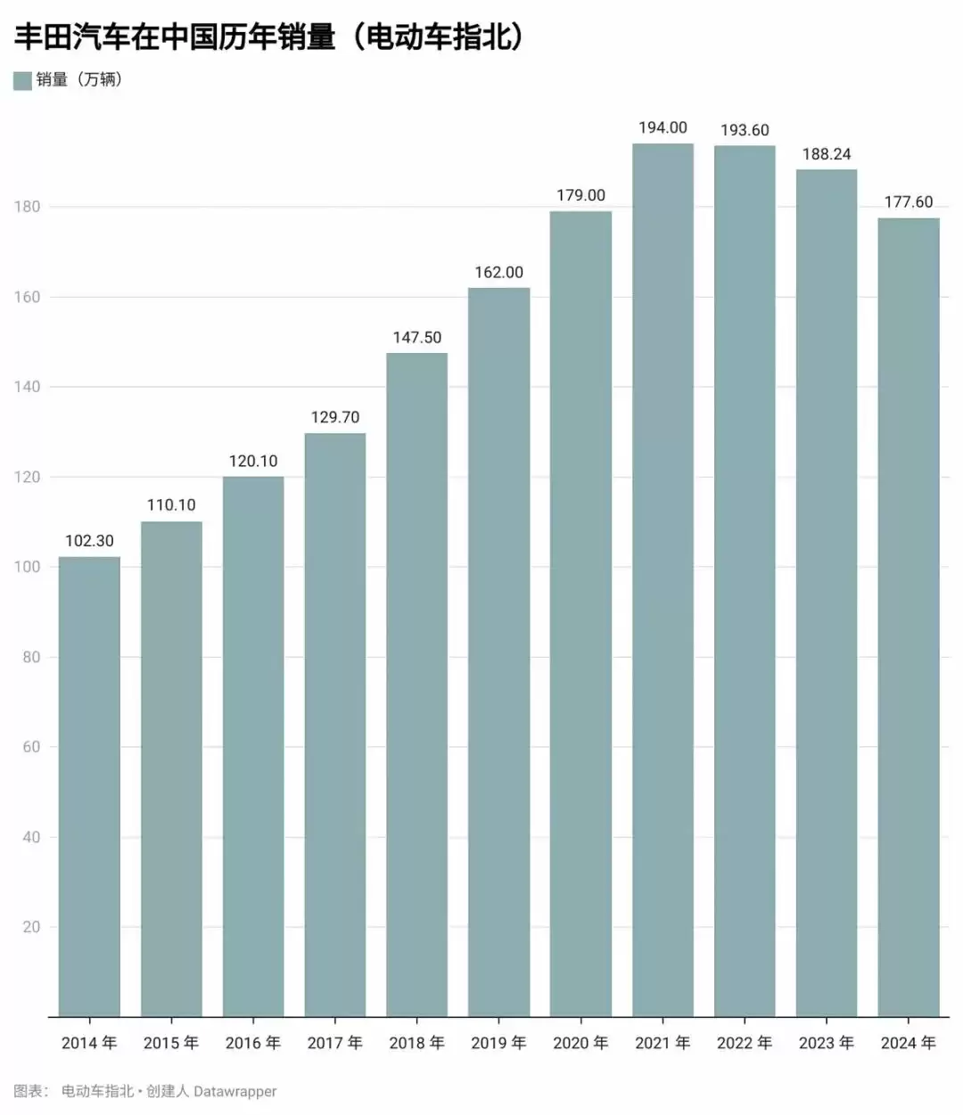 可惜好景不长,随着新能源汽车逐渐崛起,丰田进入了连续下跌的困境期,2024年、2024年在华累计销量分别跌至188万辆、178万辆。