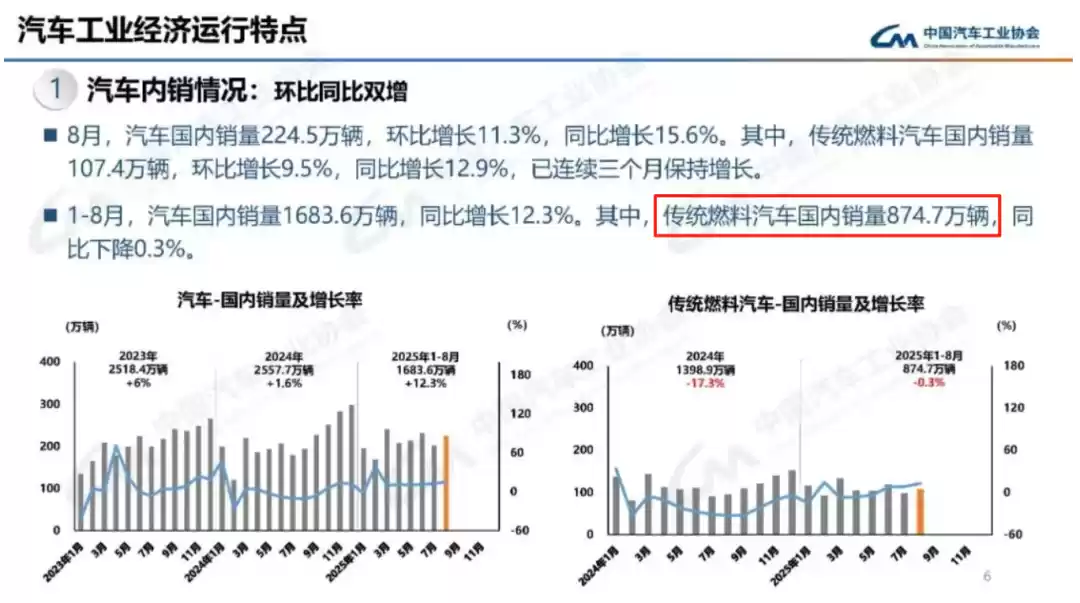 中国汽车工业协会数据显示,1-8月传统燃料汽车国内累计销量为874.7万辆,相比2024年同期89%的市场占比减少了超三十七个百分点。