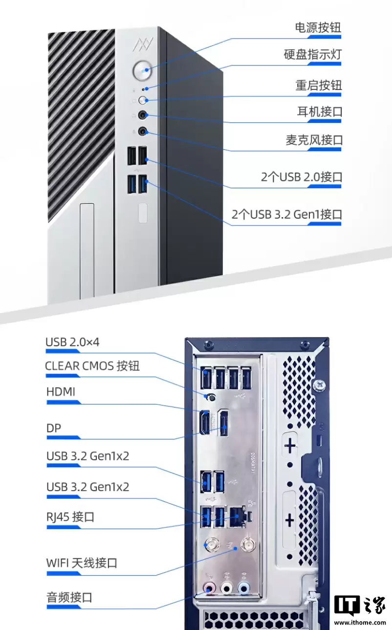 接口配置方面,机身前部设有2个USB-A 3.2 Gen1接口、2个USB-A 2.0接口以及两个3.5mm音频插孔;背部则配备4个USB-A 3.2 Gen1接口、4个USB-A 2.0接口、1个RJ45网络接口,并搭载集成显卡专用的HDMI和DisplayPort视频输出接口。