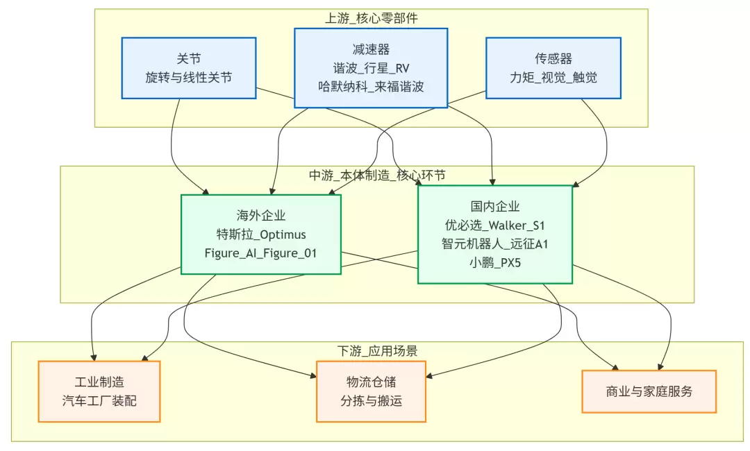 人形机器人产业链可划分为上游核心零部件、中游本体制造和下游场景应用三大环节。