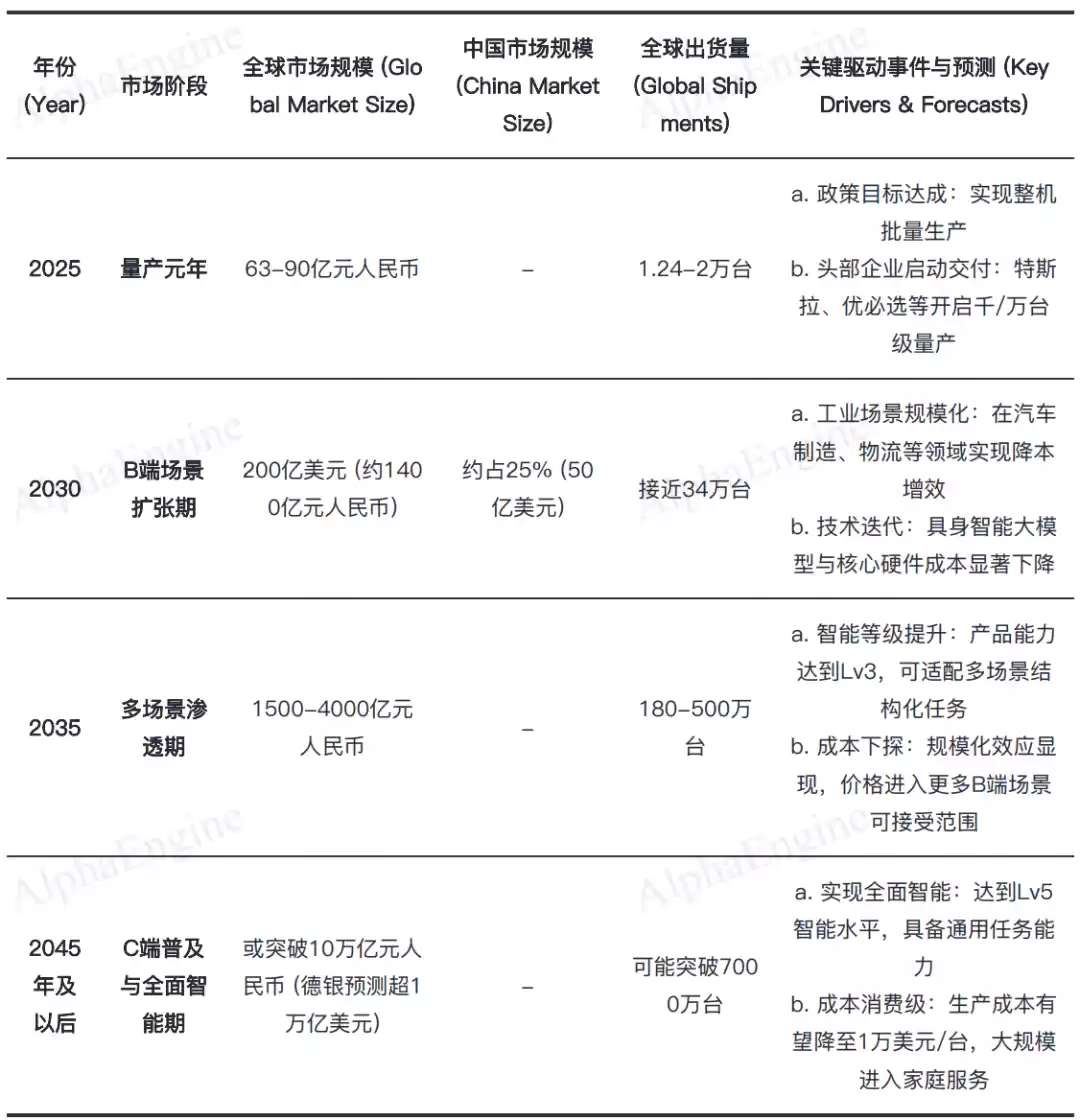 长期来看,人形机器人有望实现C端普及,全球出货量超7000万台,市场规模突破10万亿元。
