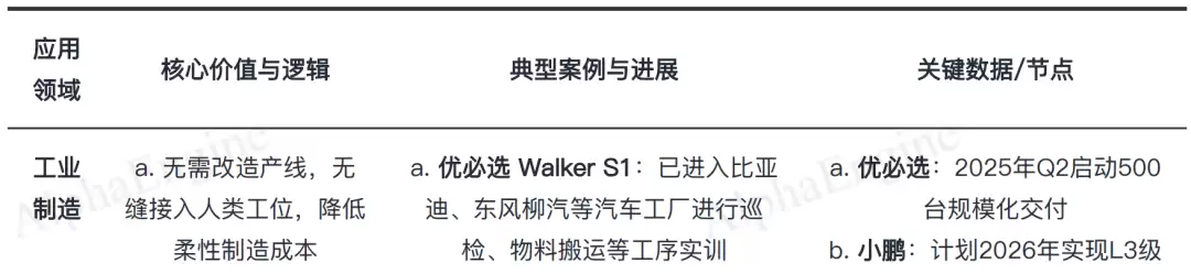 工业制造是首要落地场景,特别是汽车工厂,如优必选Walker S1已进入比亚迪和东风柳汽的产线进行实训。