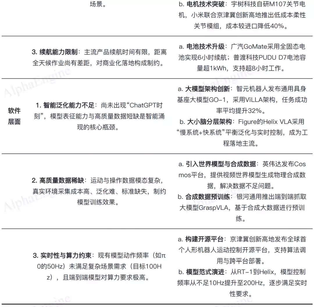 硬件层面聚焦于“降本、量产、续航”三大核心挑战,而软件层面则致力于解决“智能泛化、数据稀缺、实时性”三大技术瓶颈。
