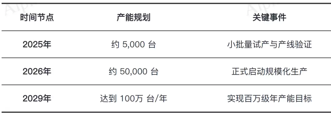 特斯拉为Optimus机器人设定了极具挑战性的产能爬坡目标,旨在通过复用汽车领域的规模化制造经验,快速实现百万级年产能。