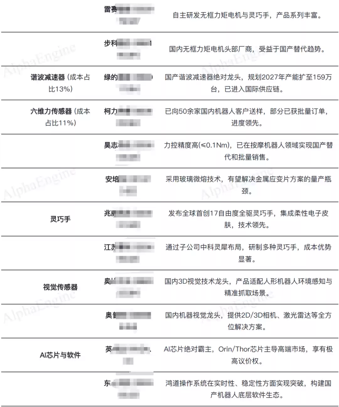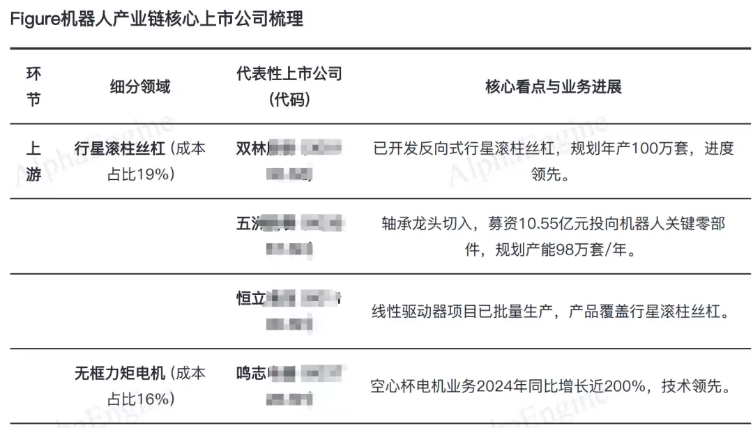 以下是AlphaEngine整理好的Figure机器人核心供应链图谱,具体表格不适合放在文中,可以私信领取。