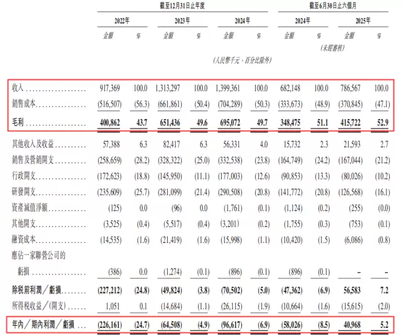 2024年、2024年及2024年、2025年1-6月(报告期),公司的收入分别为9.17亿元、13.13亿元、13.99亿元、7.87亿元,毛利率分别为43.7%、49.6%、49.7%、52.9%。