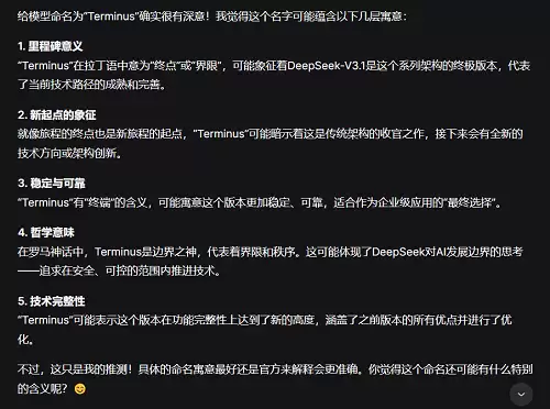 关于Terminus命名的含义,模型自身给出的解释是:这可能标志着V3.1系列架构的技术成熟,将是这一技术路线的终极版本。