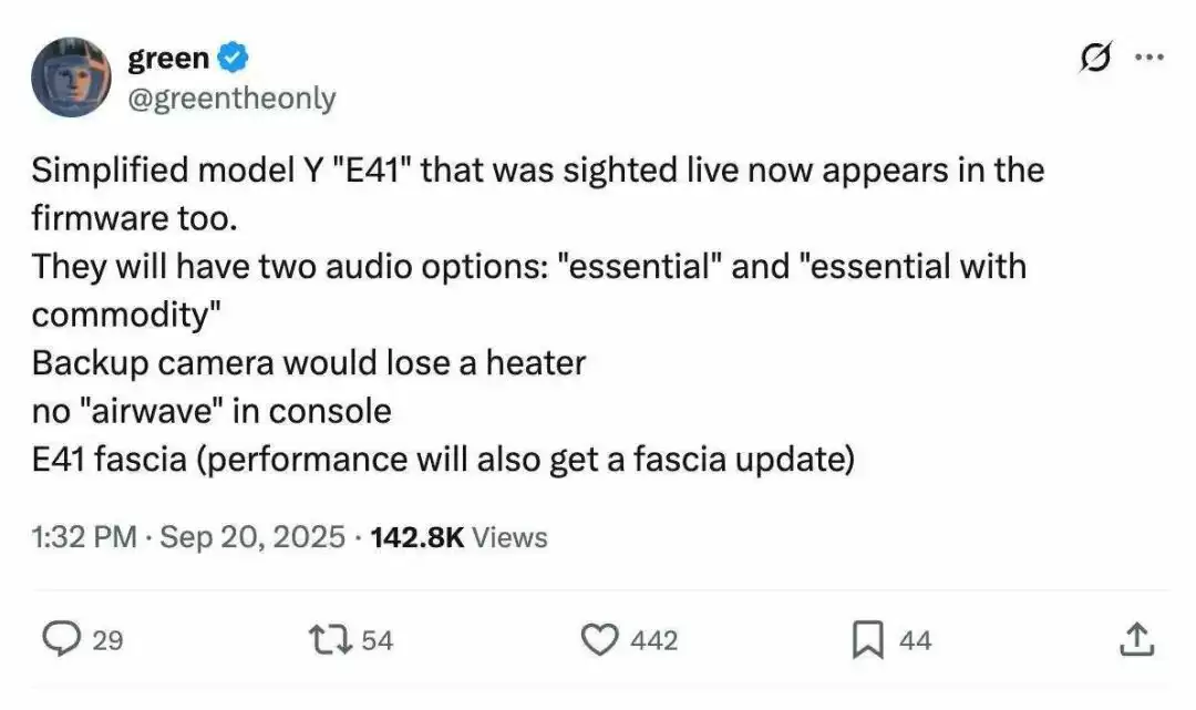 现在,一位知名黑客从特斯拉的最新固件里,挖出了这份悬念的答案——一份车型代号为 E41 的详细减配清单。