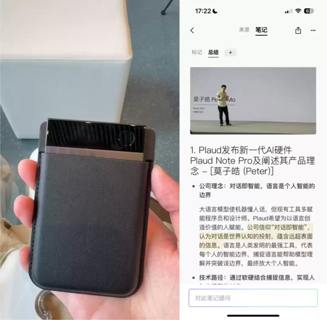 比如,Plaud新推出的“Ask Plaud”功能,让用户与AI对录音内容进行问答。莫子皓提到,这个功能准确来说,叫做“Plaud Ask”:“别人都是让你去问AI问题,我们是让Plaud来问你。”