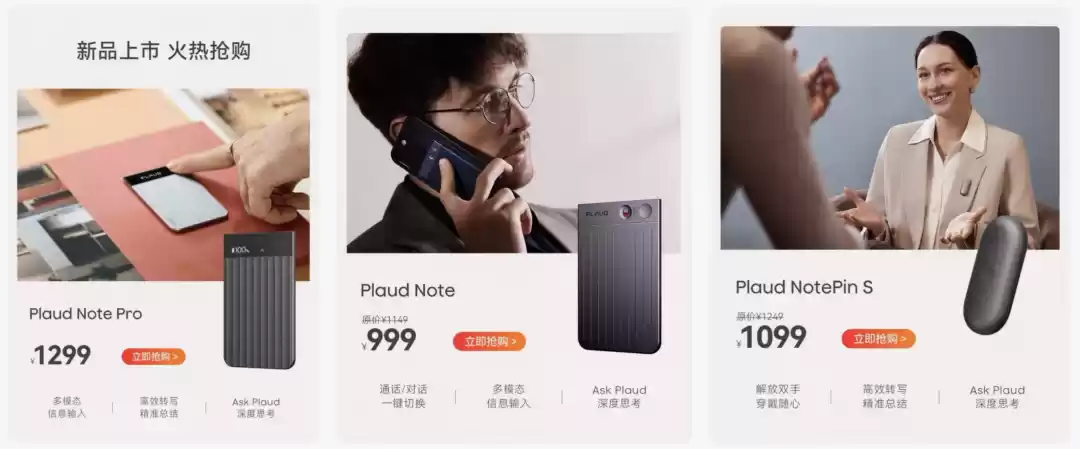 △Plaud Note Pro定价:国内1299元/海外179美元;Plaud Note定价:国内:1149元/海外:159美元;Plaud NotePin S定价:1249元(海外尚未发售)。图源:最新旗舰店