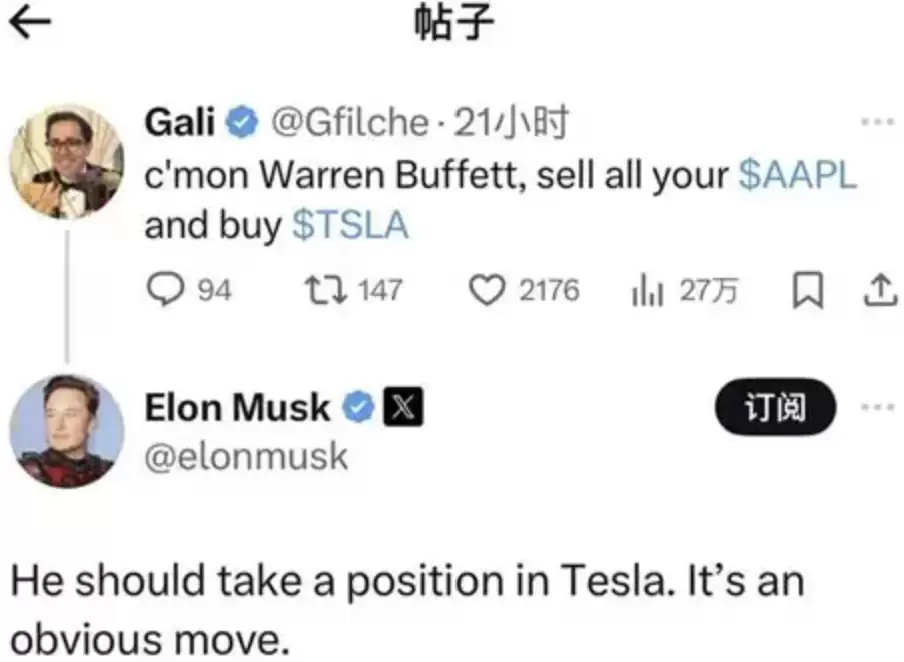 马斯克对于巴菲特没有投资特斯拉这件事,也有点耿耿于怀的意思。2024年时马斯克曾在社交媒体上公开表示,2008年特斯拉估值仅2亿美元,但巴菲特的合伙人芒格回绝了这个历史性的投资机会。