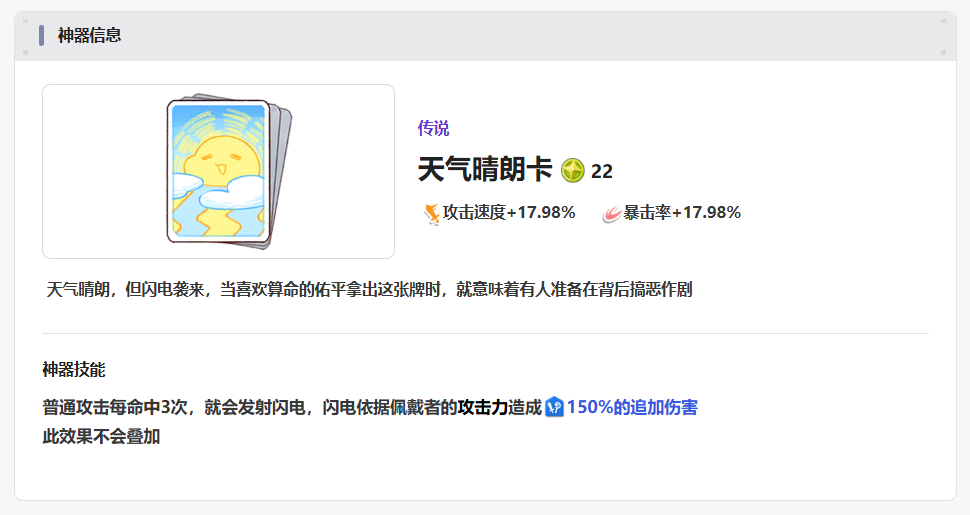 第四个神器叫做天气晴朗卡,带来的攻速以及暴击概率加成比较高,这里大家如果拥有攻击命中3次的效果的话,那么在后面还可以连续发射一个闪电,带来一次最佳攻击的能力。