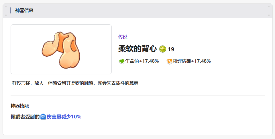 第6件神器为大家推荐柔软的背心,这个神器本身是适合给一些辅助类角色使用的,因为它主要的加成是放在生命值以及物理防御属性加成上面的,所以在技能上面使用的话,可以减少对面受到的伤害数值,也是会有很强的抵御效果。