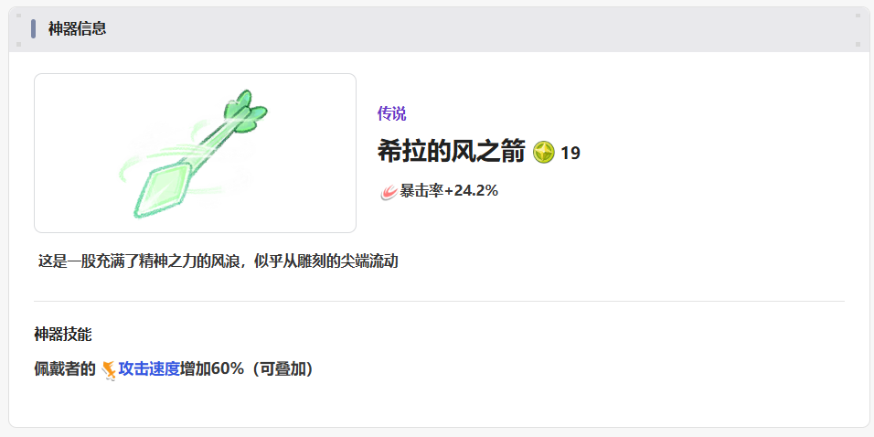 第5个神器叫做希拉的风之箭,这个神器更适合一些风属性的角色使用,装备这个神器带来的暴击属性加成是非常不错的,因为这里还有60%的攻速加成效果,所以叠加起来的话,大家走暴击流是非常适合的。