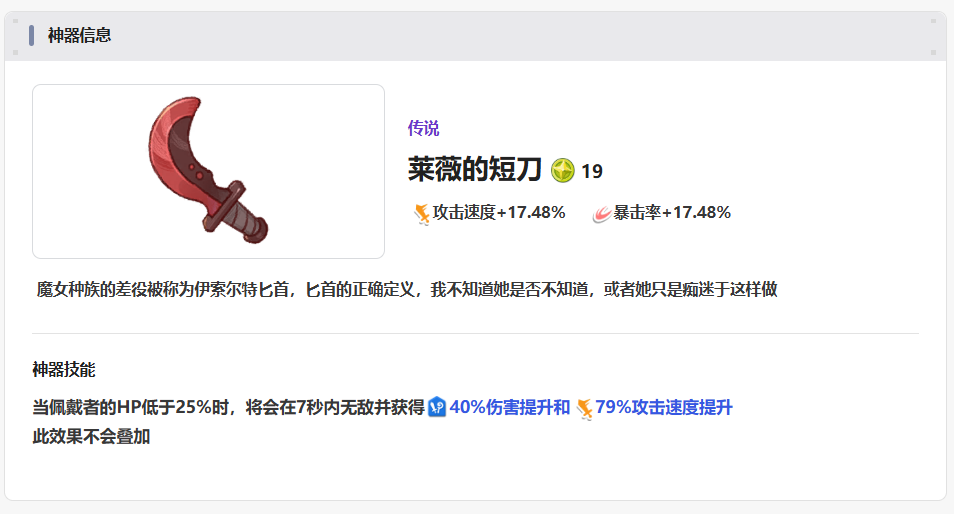 第三个神器为大家推荐叫做莱薇的短刀,这个神器在攻速有一定提升之后,还可以给角色的暴击属性都带来一定的数值加成,在效果上面,大家可以根据目前血量的数值来操作,因为只要是在血量状态低于25%的时候,这个神器就会给大家增添无敌的效果,无敌状态会一共持续几秒时间,在这个无敌状态之内,角色的伤害会有40%的提升,并且在攻速上面达到最高的提升效果会达到79%的数值,这个数值比很多的角色在技能的提升数值上面要高了。