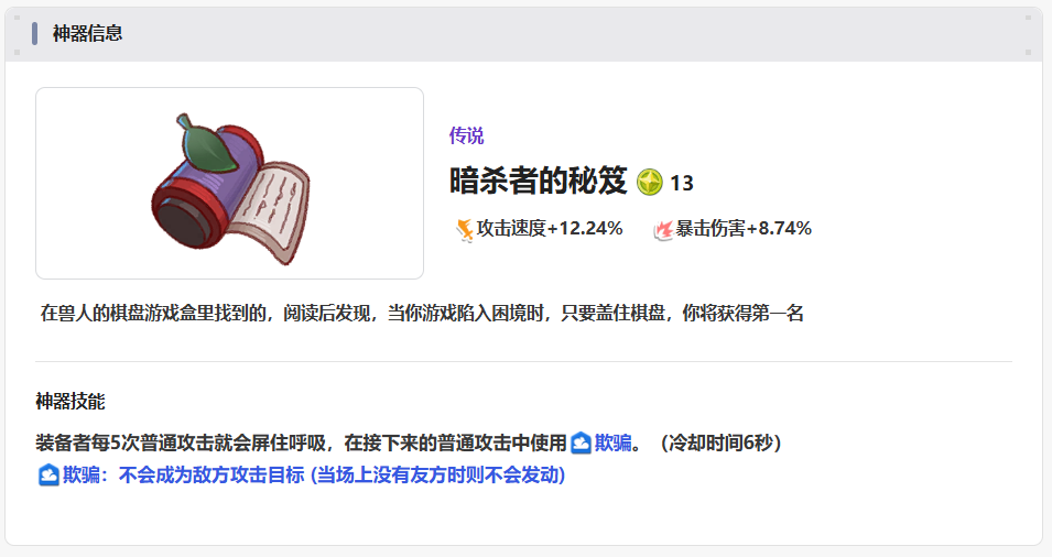 第2个神器叫做暗杀者的秘籍,这个神器目前也是带有一定攻速提升效果的,但是另外的效果上面是在暴击伤害属性当中,装备之后带有一定的加成效果,所以拥有的装备在攻击的时候,次数只要达到5次的话,那么此时就会给到一次欺骗的效果施加给敌人,欺骗的这个效果的用处还是比较多的。