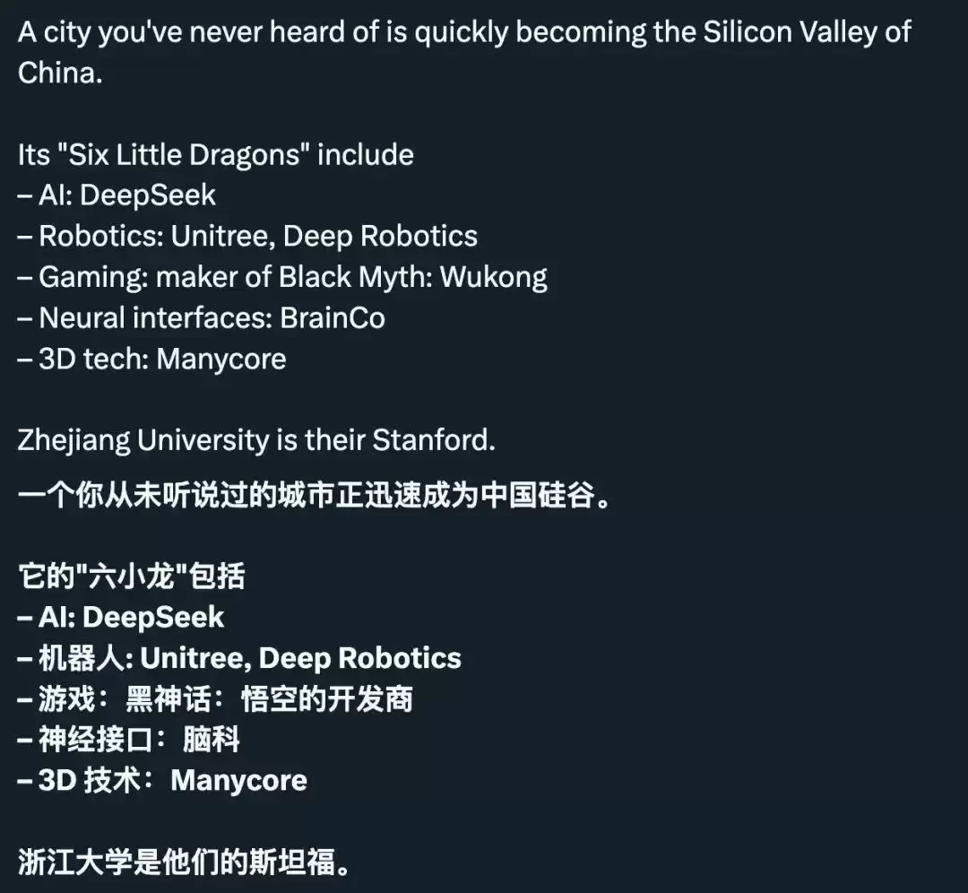 今年2月,英国《经济学人》在一篇关于DeepSeek的专题报道里,点名浙江大学是这家公司的背后推手之一,并直接拿“杭州与浙大”类比“硅谷与斯坦福”。
